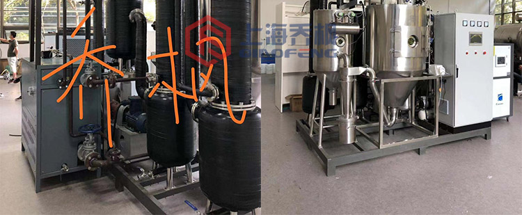 The device is specially aimed at organic solvents, and the inert gas medium formed by circulating nitrogen is used to replace the usual air medium for spray drying. In addition to recycling products, organic solvents can be recovered. In view of the characteristics of low flash point or micro toxicity of organic solvents, it is flammable and explosive. The closed cycle spray system is specially designed.
