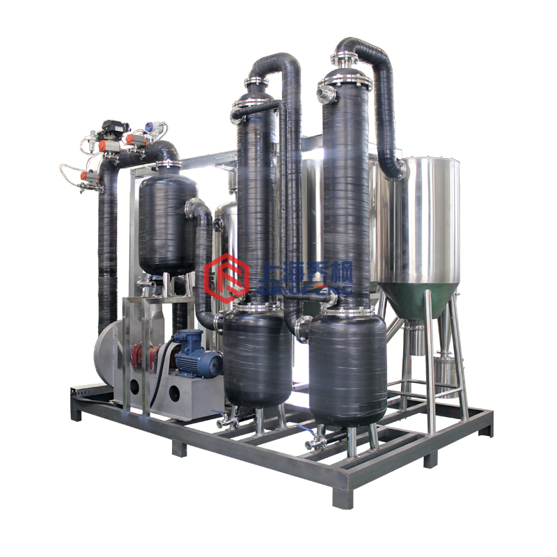 The condensing system is composed of a refrigeration unit, a condenser, a refrigerant circulating pump, a filter, a heat exchanger and a connecting pipeline. The "wet" gas (including vaporized organic solvent steam) discharged from the dust collector enters the condenser, and the gas is cooled by the condenser to return to the gas circulation system, and the organic solvent steam is automatically discharged into the solvent tank through the liquid level controller at the bottom of the condenser after condensing recovery.