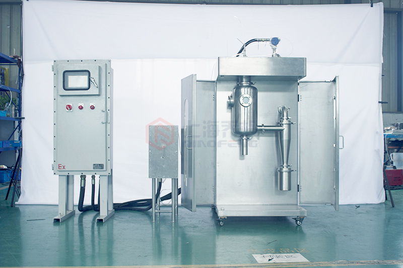 設備主要由:送料系統、加熱系統、霧化系統、噴霧干燥系統、惰性氣體循環系統、產品回收系統、冷凝系統組成。